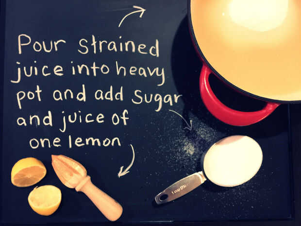 Para cocinar la pectina poner el jugo colado en su olla grande u olla, agregar el jugo de un limón (variedad de semillas y pulpa) y las 6 1/3 tazas (1.5 kg/150 cl) de azúcar.