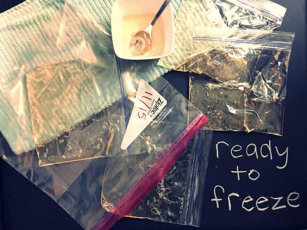 Una vez que la pectina ha espesado lo suficiente, retirar del fuego y deje que se enfríe hasta que esté cómodo al tacto. No quieres jalea fundida derretir tus bolsas y hacer un lío de su cocina. Mida las porciones de 1 taza en pequeñas bolsas de plástico zip-top. Un embudo de conserva puede hacerlo menos sucio pero no es necesario. Trate de exprimir el exceso de aire antes de sellarla, me gusta poner mis porciones individuales dentro de una bolsa de zip-top seguro más grande congelador y escriba la fecha en la bolsa antes de echar en el congelador.