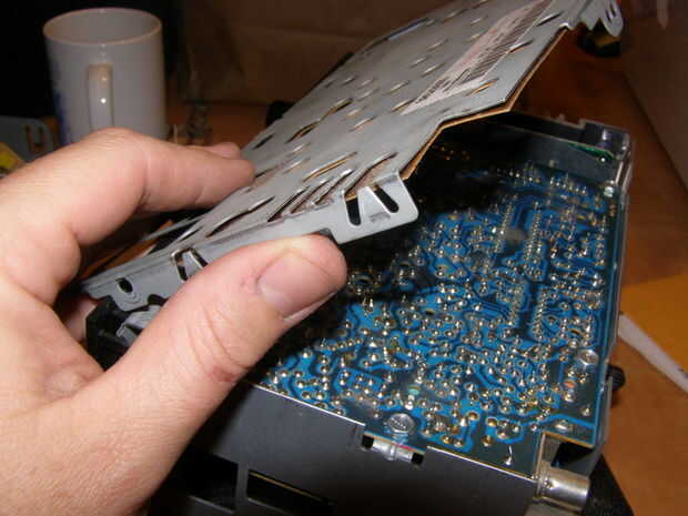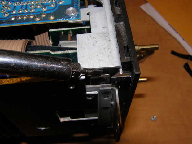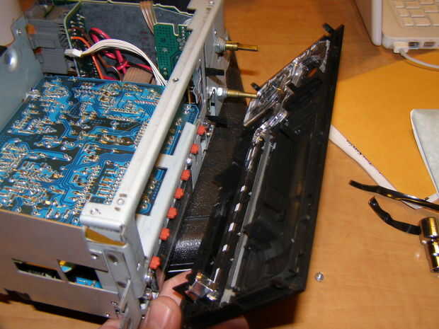 Usando un aprietatuercas y cortadores de alambre, quitar tornillos, las tuercas o los cables que sostienen la placa frontal en el cuerpo de la radio. Tenga cuidado de no agrietar o romper la placa.