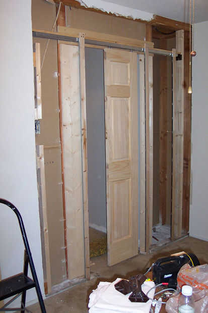 Con todos los postes que interfieren de la pared, sujeta la pared trasera con 3/4" espesor tableros de madera, que aún que deja espacio para la puerta viajar a través de la pared. Añadido un nuevo poste de madera de 2 x 4 de un lado para apoyar la pista de puerta de bolsillo y había instalado la pista y una puerta la mitad usando el hardware incluido. Se puede ver a continuación cómo la voluntad de una mitad Deslice dentro de la cavidad de la pared.