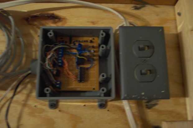 Había montado en un zócalo DIP, un relé y algunos otros componentes en un tablero de perf de Radio Shack y colocar todo dentro de una caja de plástico. Yo también atado con alambre en dos interruptores de alimentación de AC, un suministro corriente alterna adaptador de pared para que el circuito y la otra provee potencia al compresor en el ático. Quería que todo el sistema a ser habilitado y deshabilitado de este "control panel", incluyendo el suministro de aire.