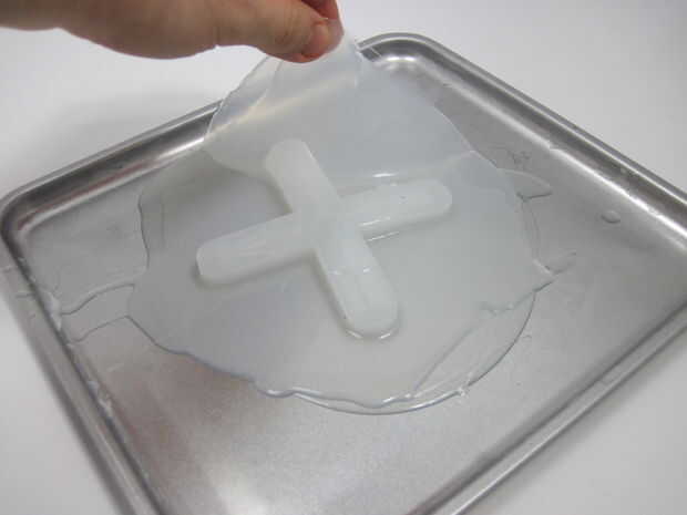 Pelar cuidadosamente toda la hoja encima de la bandeja. Tenga cuidado de pelar lentamente para no rasgar el caucho.