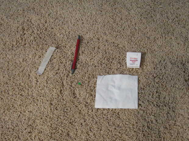 Necesita una pluma click, hilo dental, una sección cuadrada de papel de inodoro, una bb de airsoft, 3 pulgadas de cinta de enmascarar, plyers (opcionales) y una pieza roja o amarilla KVG (barra)