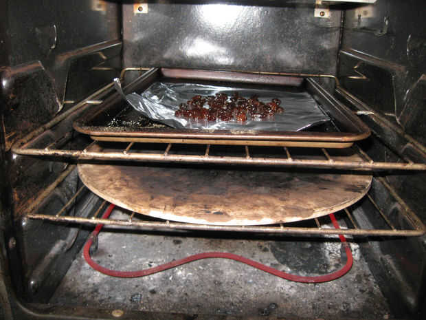 Usted podría utilizar un deshidratador para secar tus pasas, pero acababa de usar el horno. Quité de la jarra y había escurrido en una espumadera grande. Repartirlos en un pedazo de papel de aluminio y los puso en el nivel superior. Coloqué una piedra de pizza gruesa de la arcilla en la rejilla inferior para igualar hacia fuera el calor. Puse el horno en la posición más baja posible y dejó la puerta entreabierta. Dejé en el horno, les comprobar cada hora o así, hasta que se secaron fuera y pasa como otra vez. Cuando se hicieron dejan enfriar y almacenar en un recipiente hermético.