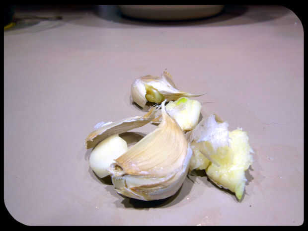 Machacar los dientes de ajo con lo que es útil. Utilicé el fondo de un recipiente de acero que estaba dentro de alcance de brazos. :) No hay necesidad de pelar el ajo.