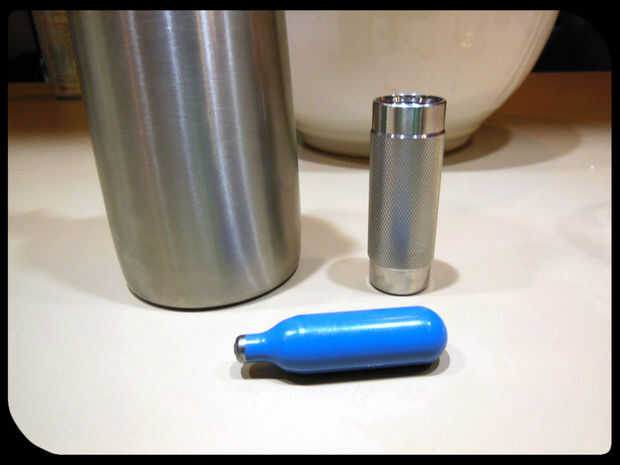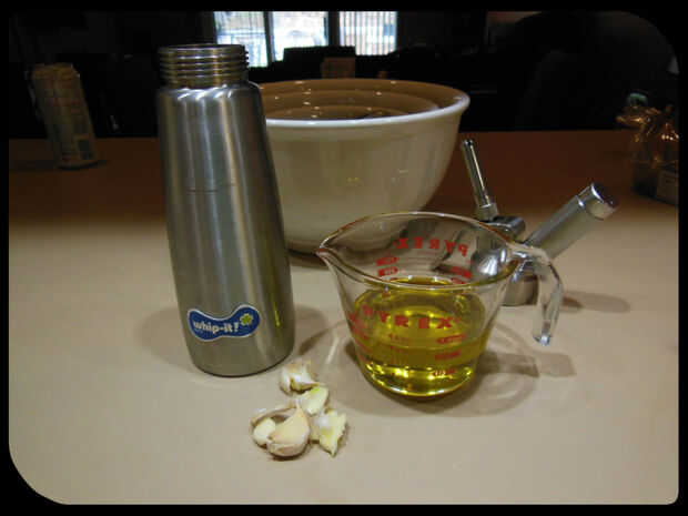 Añadir el aceite y el ajo al sifón e Inserte el cartucho de nitrógeno. Crack el cartucho y dar el sifón un buen batido o dos.