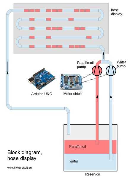 Las bombas presionando un patrón de agua y aceite de parafina rojo en la manguera. Al final un texto será visible.