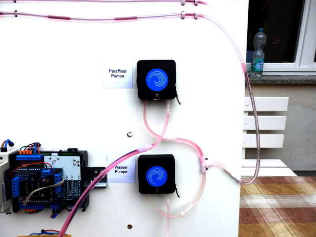 Taladro 2 agujeros en el panel de madera y montaje de las bombas en los agujeros de esta. Conecte la manguera como en la foto de arriba. Tienes que conectar los cables de la bomba parafina paso a paso 1 poner del protector y la bomba de agua a la salida del paso a paso 2.
