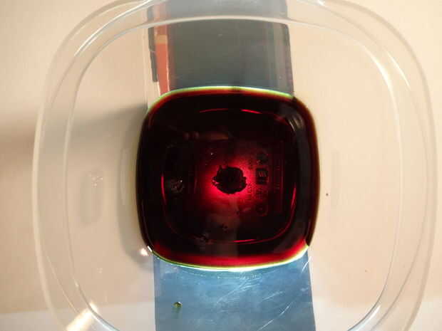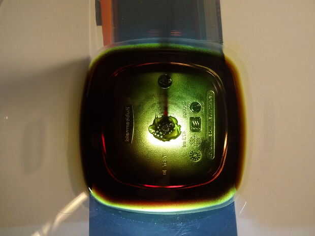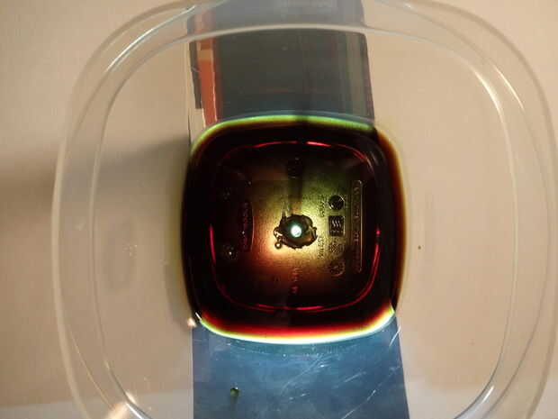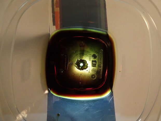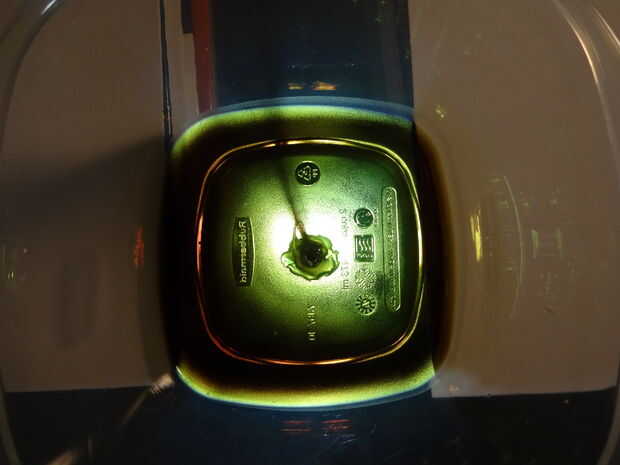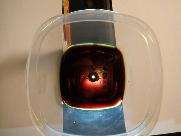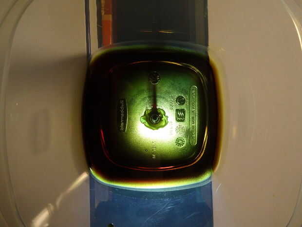 Puede ser unas poco difícil tomar fotos de un efecto que se basa en aspectos de la visión humana. Así que para mejorar, me cambié a un contenedor transparente, mientras que la iluminación de la parte inferior del envase. Esto me permite poner más fácilmente más luz a través de la muestra e iluminar mejor el aceite.