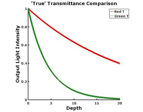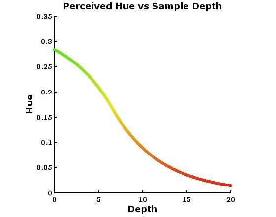 Para responder a esto, he creado algunas simulaciones en octava * (Matlab compatible) que utilizan cerveza - ley de Lambert. Cada espesor del líquido, se absorbe una fracción de la luz. Esto conduce a una disminución exponencial de la intensidad de la luz que lo hace a través de la profundidad de la muestra. Tomando el rojo y verde, encontrar la tonalidad de la luz en cada profundidad. Sin embargo, este modelo predice que aceite calabaza sólo cambia de amarillo a rojo. Otra vez, ¿por qué verde?