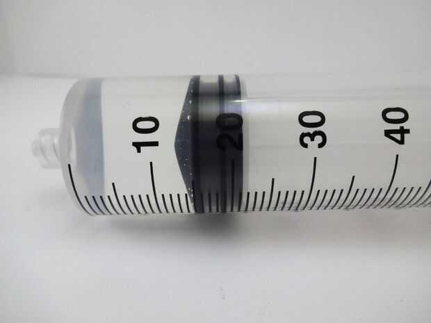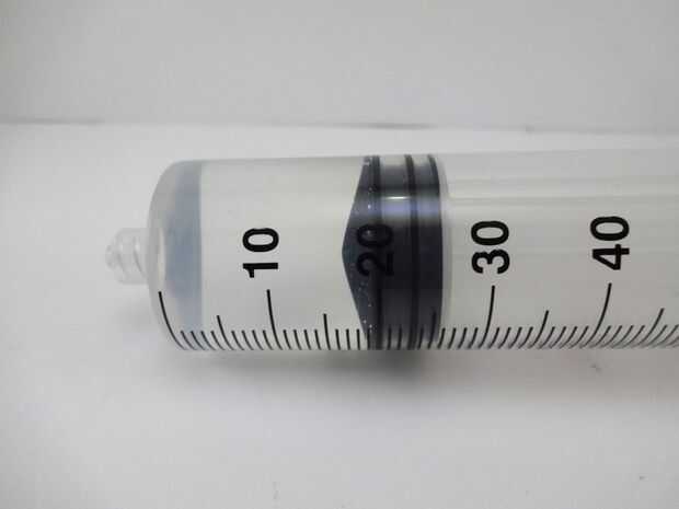 Leer una jeringa del sello más cercana hasta el final. En la primera foto, la jeringa contiene 20 ml, mientras que en la segunda imagen la jeringa contiene 15 ml.