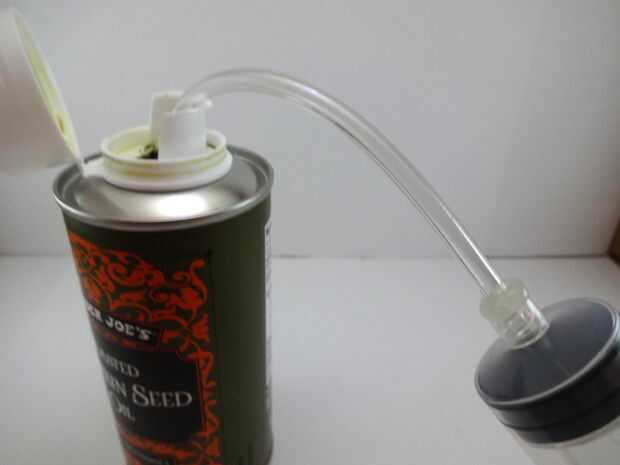 Una vez que has llenado la jeringa y el tubo, retire el tubo de la lata de aceite de calabaza y tire hacia atrás del émbolo un poco más. Esto llena el tubo de aire un poco más y deja el aceite se filtre desde el extremo (toallas de papel recomendados).
