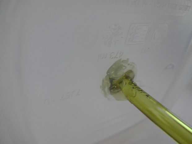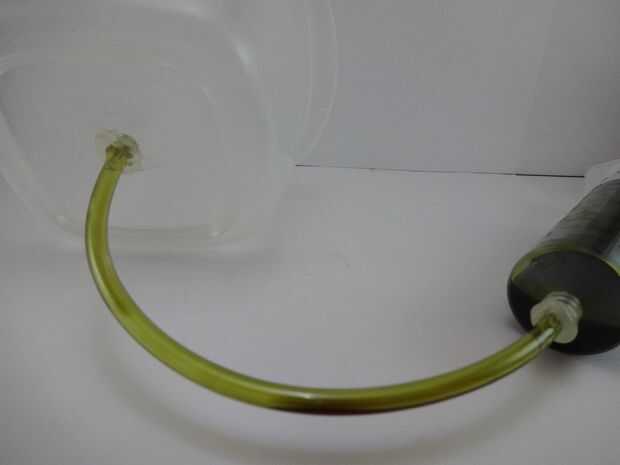 De manera similar a cómo une el tubo a la jeringa, conecte el otro extremo del tubo a la parte inferior de su contenedor. desea que la parte superior del tubo para quedar al ras con la parte inferior del envase.
