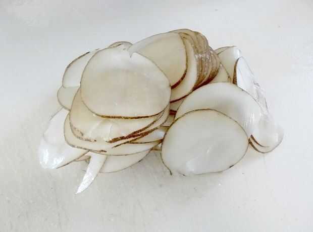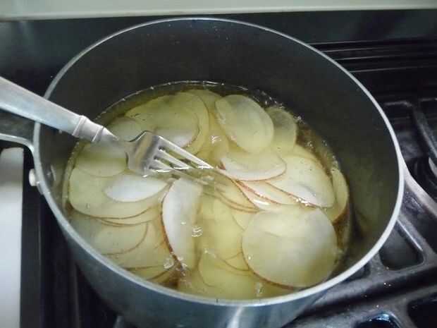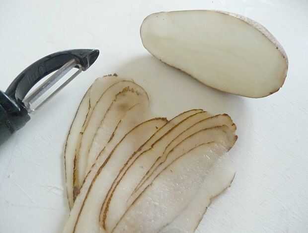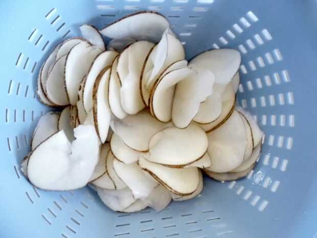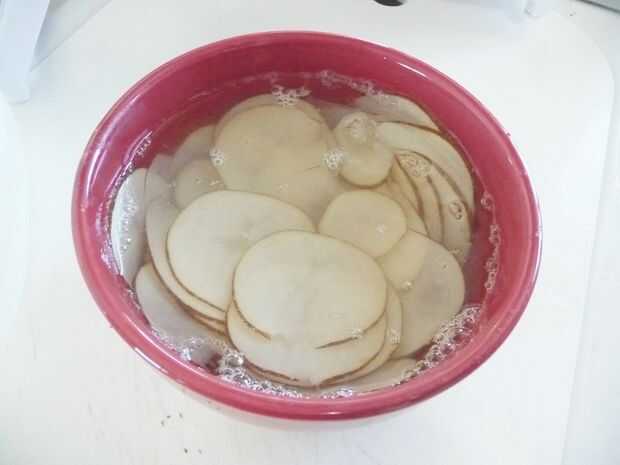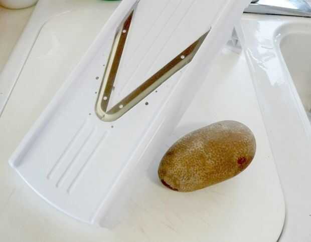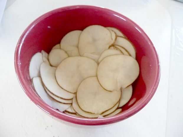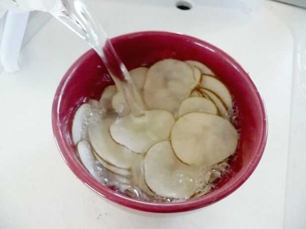 Cortar finamente la papa con un pelador de patatas o mandolina. Colocar los chips de crudo en un bol grande y cubrir el completamente con agua. (El agua volverá turbio enseguida. Es el almidón de la Copa). REFRIGERA durante 30 minutos, una hora, o incluso durante la noche.