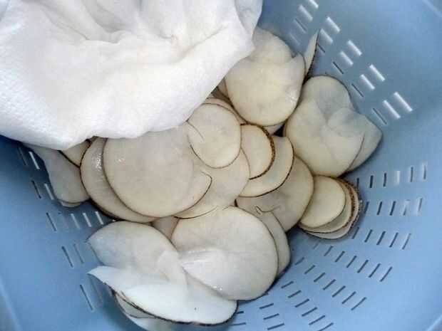 Cuando estés listo para freír, poner las fichas en un colador y enjuague brevemente con agua fría. (Este ayuda a quitar cualquier almidón que puede haber colocado entre las rodajas). Dejar para drenar durante varios minutos. Secarlos con una toalla de papel. Está bien tener algo de humedad... no desea les goteo mojado.