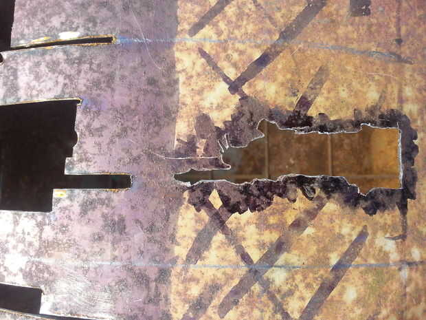 He perforado un agujero en el centro y usa la sierra caladora cortar hacia fuera. Utilizando el juego como un archivo aquí realmente vino práctico como este corte más complicada en comparación con los edificios que tienes que conseguir las curvas y tjings justo.! Utilicé una hoja de sierra para hacer las puntas alrededor de su cabeza porque el rompecabezas sólo fue doblar el metal hacia arriba y hacia abajo... y la hoja de sierra más fina. Entonces utilicé solo archivos pequeños para suavizar todo y remodelar hasta lo tenía lo que quería.!