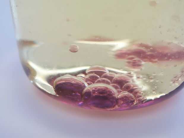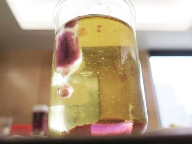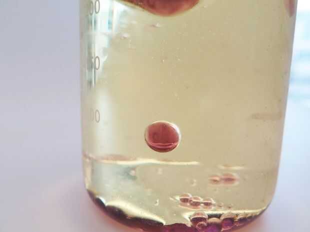 Cuando la gota cae al fondo de la jarra, forma dentro de una esfera (la forma ideal para reducir al mínimo un área superficial al cociente del volumen). Una vez que golpea la parte inferior, muchas gotas permanecer separadas debido a las tensiones de superficie en el límite del aceite/de agua, pero después de un tiempo, se unen.