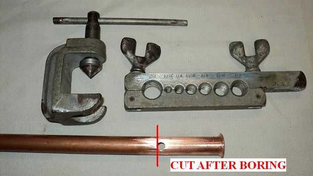 Retomando el trabajo en el tubo, de centro perforó un 1/4"[6mm] Cruz hoyos a poca distancia del extremo del tubo y luego, utilizando una herramienta de abocardar, creado un adaptador en el extremo superior. El propósito del agujero cruzado es permitir que el aceite en la cámara de tubo y sin embargo restringir su libre flujo en caso de malestar. Después de un papel de lija de limpieza, hacksawed el tubo en la parte inferior del agujero transversal, permitiendo que se abra terminado. Amplié la parte inferior del agujero cruzado con cortador diagonal formando un arco bonito donde se encuentra con la parte inferior de la lata.