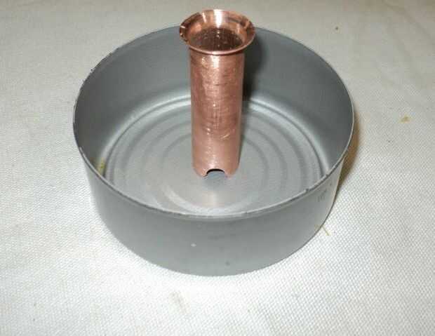 Después de un almuerzo satisfactorio, lavé el atún de lata y la tapa antes de usar. Marcado el centro de la tapa, que no tiene que ser precisamente situado y simplemente condujo un golpe a través de hacer un agujero de arranque para un escariador cónico. Había emparejado el orificio para un ajuste apretado de un tubo de 1/2"(12.7 mm) de cobre, perfora un agujero pequeño goteo-recuperación de la tapa cerca del orificio del tubo y apartar la tapa.