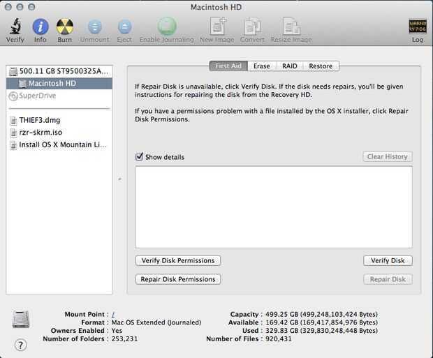 2) en el lado izquierdo de la ventana utilidad de disco, se dará cuenta de tu disco duro a menudo con la etiqueta en el tamaño, en este caso de 500 gb, debajo de él, verá la partición que tenemos que arreglar, denominado Macintosh HD o algo así. Seleccione.