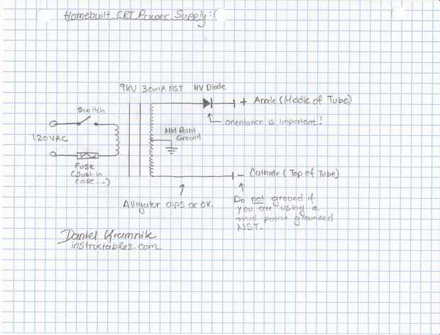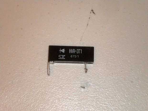 He incluido un esquema eléctrico que se muestra cómo conectar el diodo hasta el transformador. Uno de los extremos del transformador está conectado al cátodo del tubo de rayos catódicos, mientras que el otro extremo está conectado al ánodo del diodo de alto voltaje (el extremo del triángulo). Entonces, el cátodo del diodo (el segmento de la línea vertical) está conectado al ánodo del tubo de rayos catódicos. La segunda foto es de la instalación eléctrica completa y las dos últimas fotos muestran el transformador y el diodo individualmente: