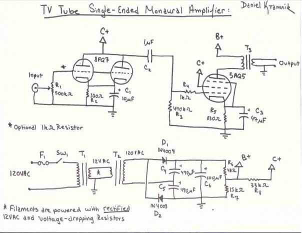 Una vez me di cuenta que estaba reteniendo los ingredientes clave a un amplificador bastante rematadamente bueno, he diseñado un circuito con qué piezas tuve (mi dibujo original de noveno grado se adjunta) y se puso a trabajar. Desafortunadamente, no tenía ningún transformador de salida conveniente, usé algo podrido de un amplificador de transistor que fue horriblemente (obviamente) no coinciden en el tubo de salida que estaba usando. También aprendí que el tubo de 5AQ5 tuve fue agujereado por el débil resplandor azul emitido durante la operación. Sin embargo, se trabajó!