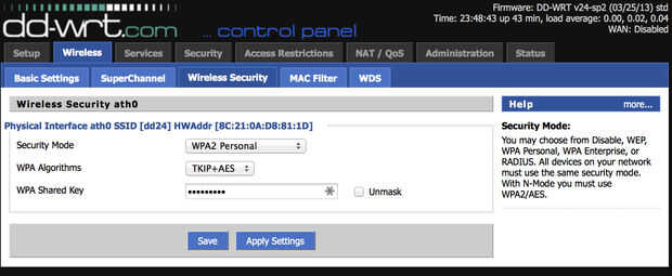 Si tienes seguridad inalámbrica configuración, haga clic en la pestaña de seguridad inalámbrica y configurar el modo de seguridad y el contraseña ya que tiene configuración en el router principal.
