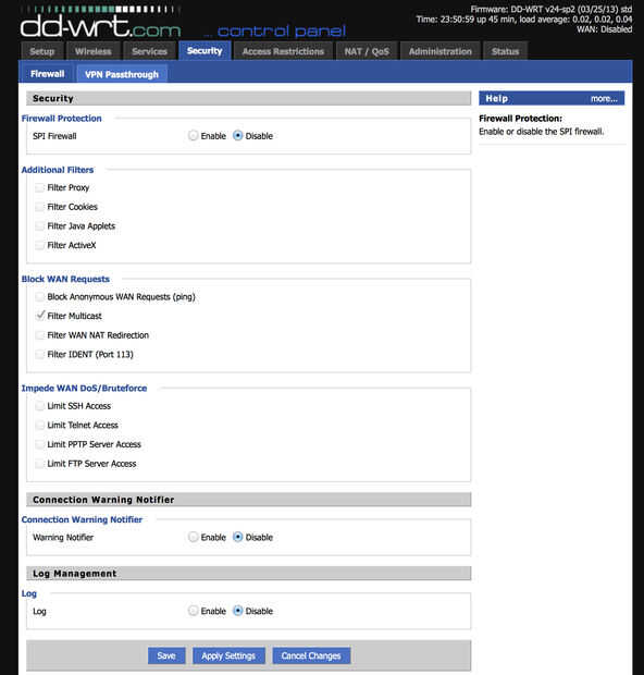 Haga clic en la ficha seguridad. Deberás desactivar todo excepto filtro muticast y luego desactivar el firewall.