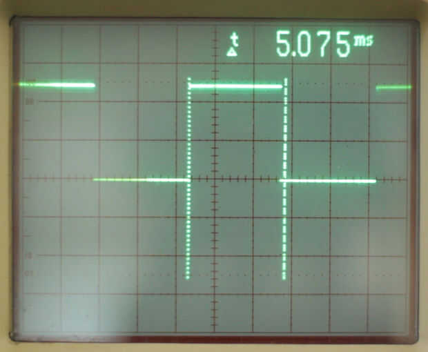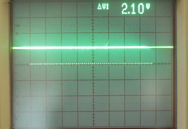 Después de probar este circuito, me di cuenta de que la onda cuadrada se convirtió en una onda triangular con 1.6V del cambio. Esto no era adecuado para mis necesidades, así que incrementé la capacitancia a 47 uF. El inconveniente de este método es que el tiempo de respuesta es más lento que el condensador se debe cargar y descargar. Usted debe experimentar con valores de condensador aquí para satisfacer sus propias necesidades. Las instantáneas de osciloscopio mostrará la salida de onda cuadrada crudo, la conversión triangular de 1uF y el resultado final de flatline DC quería.