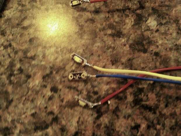 Corte una sección de los cables de cinta y dividir cada cable y los extremos de la tira. Estos son lo se de la soldadura de las luces y el acelerómetro. He utilizado hilos de color como positivo y gris como negativo.