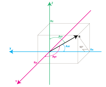 Los ángulos que nos interesa son los ángulos entre X, Y, Z ejes y la fuerza del vector R. Definiremos estos ángulos como Axr, Ayr, Azr. Se nota desde el triángulo de ángulo recto formado por R y Rx que: