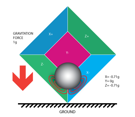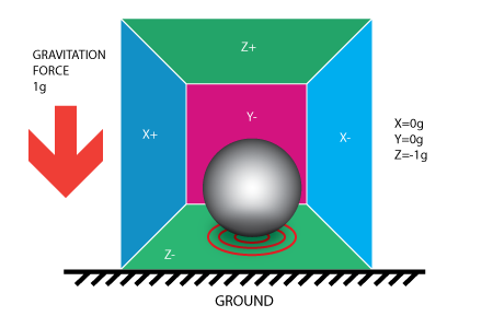 Si tomamos nuestro modelo y ponerlo en la tierra la bola caerá en la pared de Z y aplica una fuerza de 1g en la pared de fondo, como se muestra en la siguiente imagen: