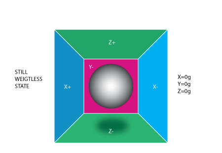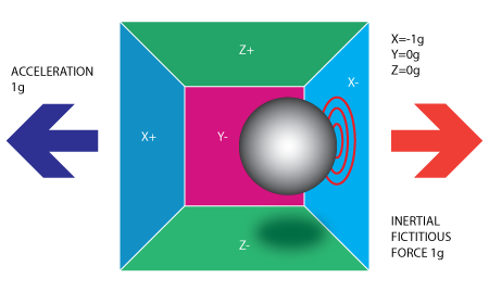 Si tenemos esta caja en un lugar con ningún campo de gravitación o de hecho con no otros campos que podrían afectar la posición de la bola - la bola simplemente flotará en el medio de la caja. Se puede imaginar el cuadro está en el espacio exterior lejos lejos lejos de los cuerpos cósmicos, o si un lugar es difícil de encontrar, imaginar por lo menos una nave espacial en órbita alrededor del planeta donde todo está en estado de ingravidez. De la foto de arriba vemos que asignamos a cada eje un par de paredes (quitamos la pared Y + por lo que podemos ver dentro de la caja). Imagina que cada pared es sensible a la presión. Si pasamos de repente la caja a la izquierda (acelera con aceleración 1g = 9.8 m/s ^ 2), la bola golpeará la pared X-. Luego medir la fuerza de presión que la bola se aplica a la pared y un valor de-1 g en el eje X.