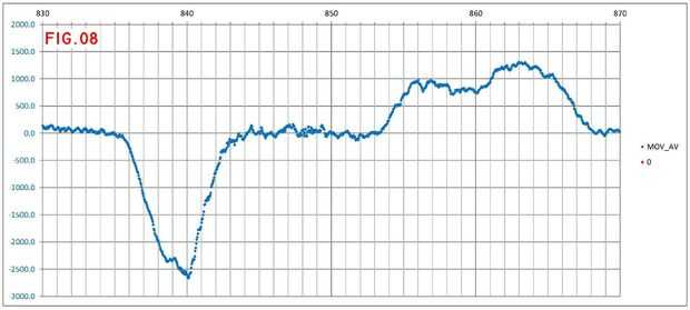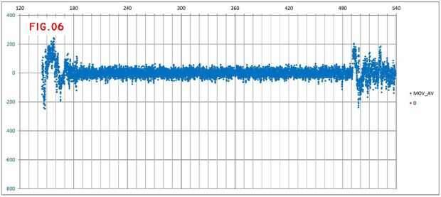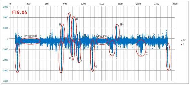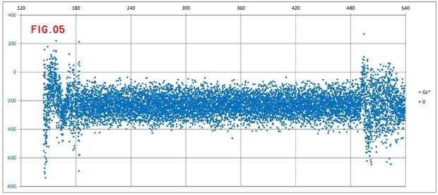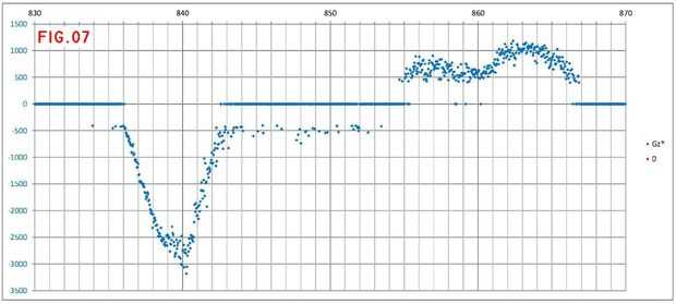 Las figuras 7 y 8 son zooms en las curvas A-B: el primero de ellos con los datos en bruto y un nivel de corte de +-400 libras, y el segundo después de aplicar la media móvil descrita anteriormente y el desplazamiento corregido. La integración aproximada de Gz por el período correspondiente a la curva A da como resultado-10870 libras, o 82.9º para el estándar sensibilidad del giróscopo. La diferencia geográfica del cojinete para la curva A es 83.2º, según los cálculos rápidos realizados en el archivo klm (véase también una carta en el anterior paso). Esto parece una comparación bastante razonable para un cálculo más sencillo.