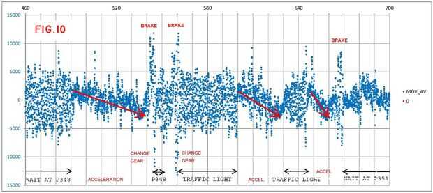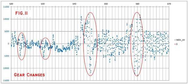 Figuras 9 y 10 muestran los registros correspondientes, la primera sin filtrar y la segunda como un movimiento promedio con los mismos parámetros en cuanto a Gz arriba. Finalmente, la figura 11 muestra el detalle de 520 a 570 segundos, donde se pueden apreciar los efectos de los cambios de engranaje automático de aceleración y desaceleración.