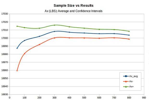 La pregunta de cuánto tiempo se requiere para la lectura de datos de calibración se puede convertir en un problema estadístico: ¿cuántas muestras se requiere de una población general para estimar con precisión el promedio? La respuesta es: como necesario para proporcionar resultados estables. Hay expresiones explícitas para el número de muestras, pero, en general y cuando sea posible, es preferible que hacer tantas suposiciones sobre la población como sea posible. Un gráfico adjunto muestra la evolución de la estimación de Ax con el tamaño de muestreo. Después de 10-15 segundos de lectura los resultados son bastante estables, y mi recomendación sería leer para 20-25 s a una frecuencia de al menos 25 Hz.