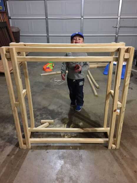 Entonces construí el marco básico de la espalda, similar a la parte delantera. Me puso las piezas sin cortar horizontal y a las cuatro piezas verticales sin cortar. Luego he añadido la pieza horizontal inferior. En este punto, me puso la parte delantera del bastidor en su lado y empujó la parte trasera del armazón en su lugar.