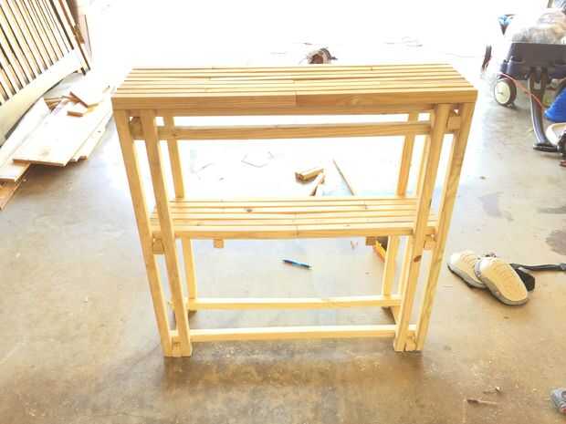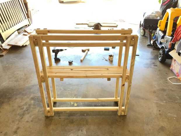 Añadir la plataforma en primer lugar, para que tuviera espacio para trabajar con sin la parte superior de la manera. Puse en los dos 10" pedazos y se aseguró de que era cuadrada. Entonces era sólo una cuestión de insertar los tornillos de la parte inferior. Fui por delante y había añadido algunos tornillos de la parte posterior del bastidor en los estantes, para un apoyo extra. Lo no hice en el frente sin embargo, porque no quería que los tornillos para mostrar.