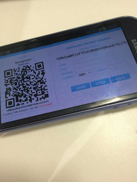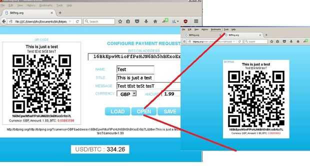 Esto se convierte el precio que entraste en bitcoin y cargar un nuevo código QR. El botón 'Abrir' carga el código QR en una nueva pestaña.