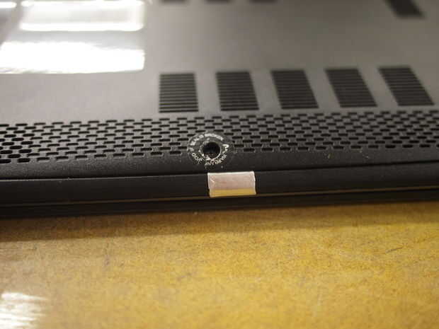 El resto de las instrucciones son más fáciles con la parte delantera de la máquina hacia usted. Pinche la etiqueta "garantía nula si el sello está roto". Luego se retira el tornillo phillips por debajo de la etiqueta engomada. Una vez retirado, utilice las patas de goma para deslizar la placa inferior de la máquina. Retirar la placa inferior y apartar. Esto permite el acceso a la mayoría de las tripas de la máquina, incluyendo el disco duro y RAM.