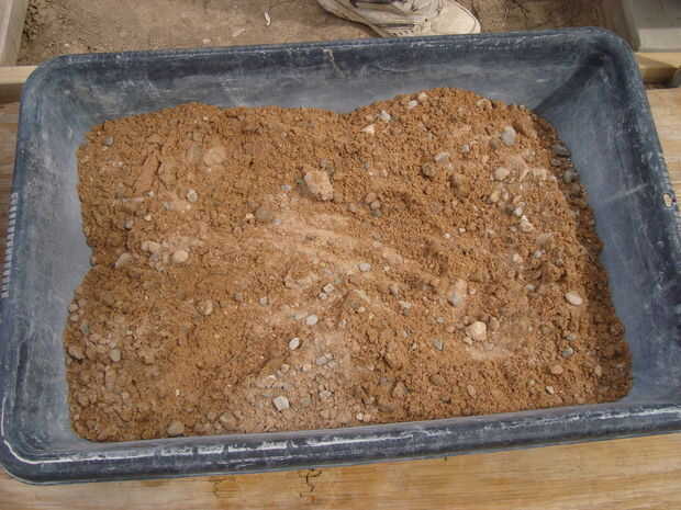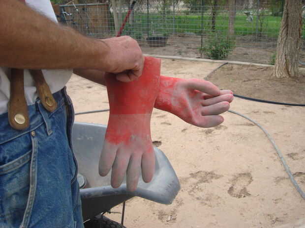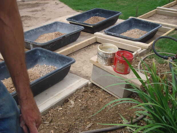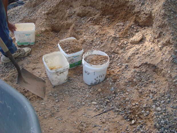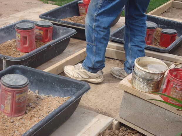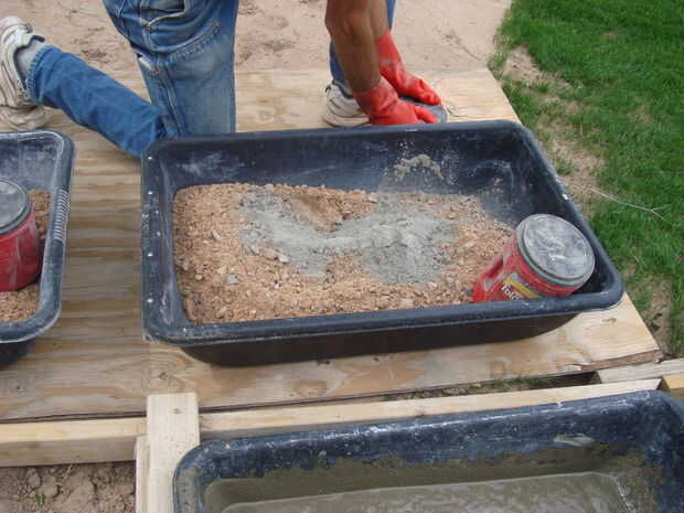 Ahora que tienes la mezcla lista poner en su protección de engranajes y verter la arena y grava en los envases negros.