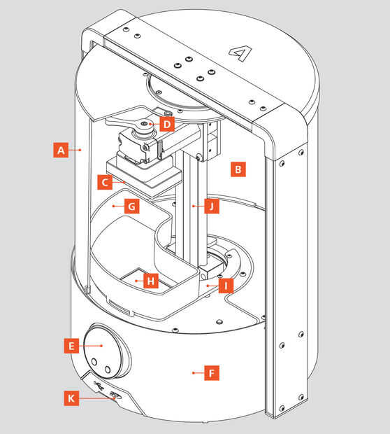 Bandeja de resina G.: la bandeja de resina contiene el material de construcción líquido fotosensible. Cuando se expone a la luz UV, la resina se solidifica, construyendo el modelo capa por capa. La bandeja se asegura en lugar con características de incrustación.