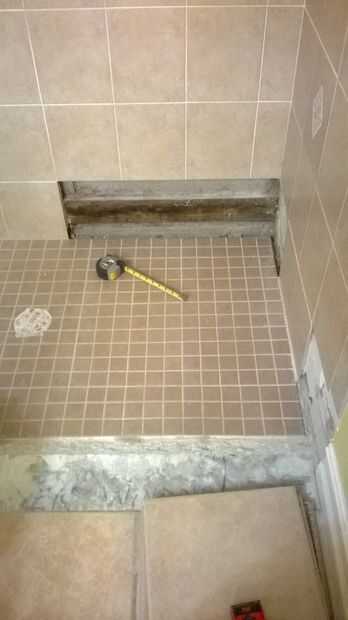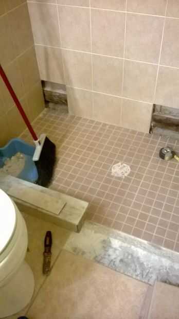 El resto del paso fue quitado por la eliminación de los azulejos con el mazo y el cincel. Los bloques fáciles de quitar, porque esta ducha fue mal construida y tenía una filtración de agua, así el paso fue sólo se celebraban por los azulejos y el mármol en la parte superior.