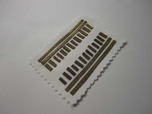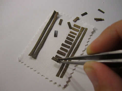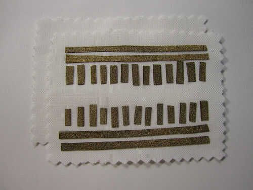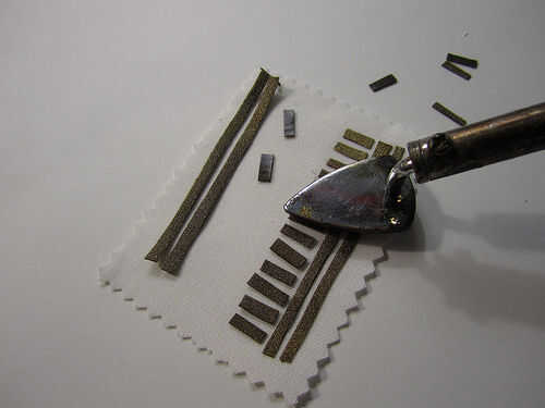 Poner los trozos de tela conductiva hacia fuera en uno de los tejidos normales rectángulos. Utilice unas pinzas si es necesario. Después cuidadosamente de hierro sobre las piezas a fusionarlos juntos.