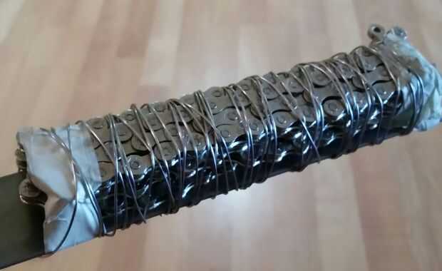 Dobla las 4 secciones en rectángulos iguales de tamaño y apilados uno encima del otro. Para mantener todo junto, me envuelve los extremos de cinta de enmascarar y luego envuelve el billete entero en alambre de acero inoxidable. La cinta adhesiva se quemará en la fragua y el cable se rompa cuando que el tocho es forjado hacia fuera.