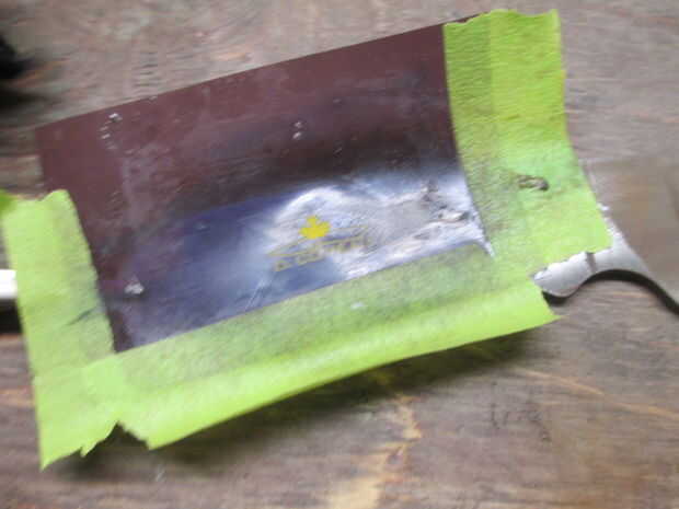 Colada del acero con agua y limpie para eliminar cualquier salmuera. Con alguna lija fina o almohadilla Scotch-brite quitar la máscara de esmalte de uñas. Acetona funciona muy bien aquí para quitar el esmalte de uñas también. (Usted probablemente ya sabe que removedor de esmalte de uñas es principalmente acetona).
