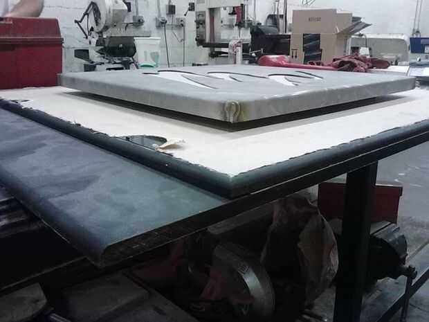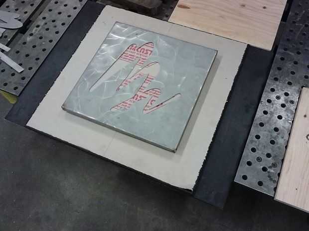 Al configurar mi archivo recortado salí fronteras completamente para facilitar la forma, en lugar de golpear en ella con un martillo y luego texturizar quería permanecer bastante plana, por qué textura y luego corte. Fue cortado en un chorro de agua y después todos los bordes a través de una rotura de la chapa. Fue entonces tig soldado con autógena en las esquinas, de tierra y con chorro de arena para mezcla hacia fuera y ocultar las soldaduras y lijar con 220 otra vez.
