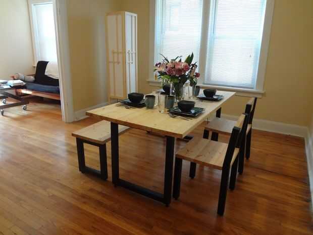 Este conjunto de mesa de comedor fue hecha principalmente de acero cuadrado tubo, algunos sobran acero plano común tenían en mano y madera de pino de dimensiones. Me sirve bien para los últimos 6 meses y ha hecho una gran adición a mi casa.