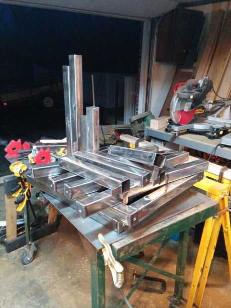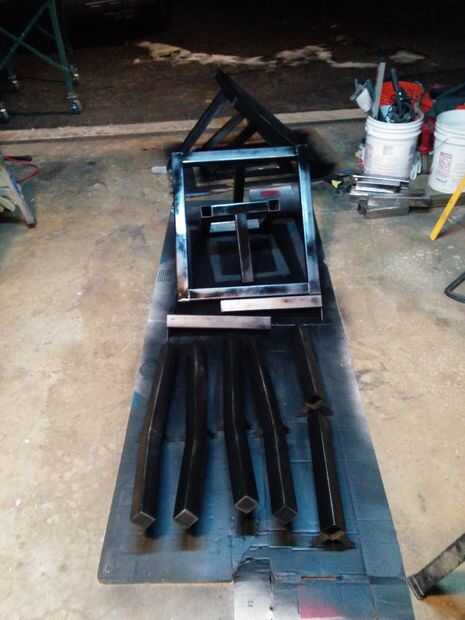 Soldar encima de la Horizontal travesaños a las patas verticales para formar un rectángulo como se muestra en las fotos. Una vez que un rectángulo, soldar 22" longitud de la tabla y longitud de 12" para el Banco, perpendicular al centro de la parte superior horizontal a miembro cruzado. (La tercera foto muestra una pata de banco y una pata de la mesa).