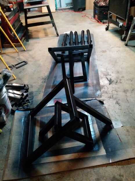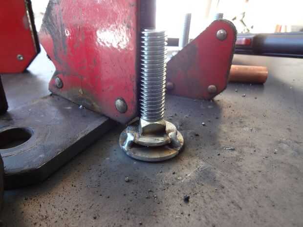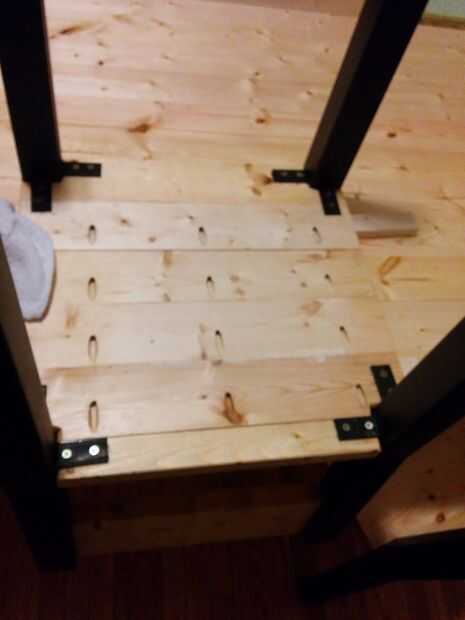 Después de asegurarse de que las piernas fueron espaciadas uniformemente desde los bordes, me perforaron 5 agujeros en el braguero de centro sólo y condujo en 3" tornillos largos.